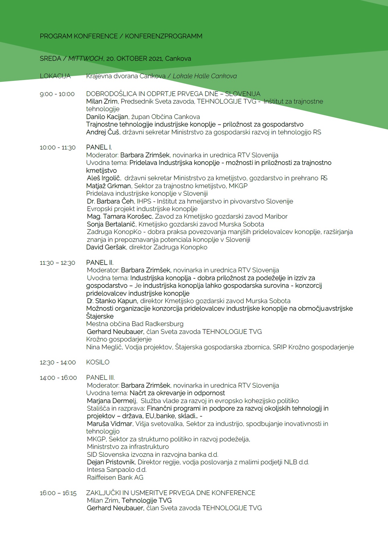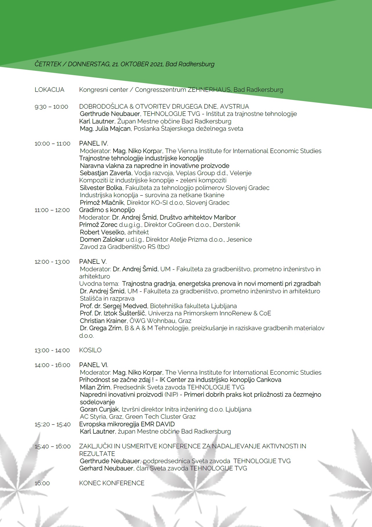 Namen konference je izmenjava znanja in spodbujanje sodelovanja v verigi industrijske konoplje. V sklopu programa bomo osvetlili celotno vrednostno verigo industrijske konoplje, identificirali priložnosti za sodelovanje in razvoj tehnologij ter predstavili primere dobrih praks.